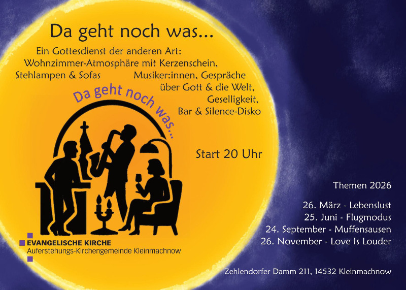 Mit dem Thema Lebenslust treffen wir uns zu einem Gottesdienst der besonderen Art unter dem Motto: Da geht noch was! Lasst uns hören, singen und miteinander ins Gespräch kommen - gemeindsam wollen wir den Abend ausklingen lassen.