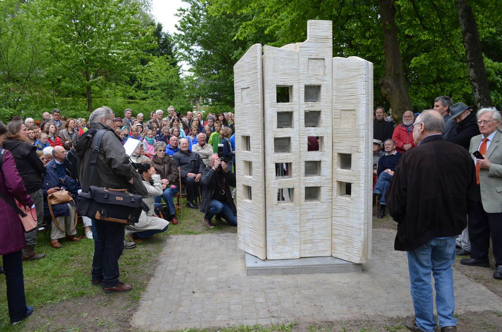 Diesen Menschen ein Denkmal zu setzen, wurde zum ehrgeizigen Ziel der Gruppe, und sie fand viele Unterstützer, wie das Künstlerpaar Julia und Rainer Ehrt, das aus Eichenbohlen die Stele in Form eines Hauses formte. In den Fensteröffnungen drehen sich Edelstahltafeln mit den Namen der Menschen aus Kleinmachnow, die halfen auf der einen, und derjenigen, denen sie geholfen haben auf der anderen Seite.