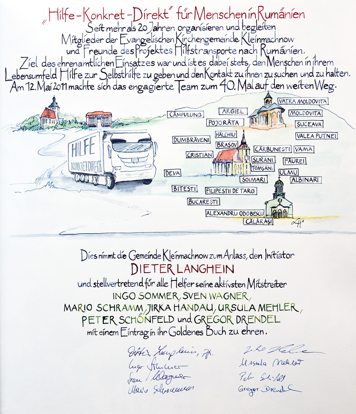 Zum 40. Mal brachten Pfarrer a.D. Dieter Langhein und sein Team von der Evangelischen Auferstehungs-Kirchengemeinde Kleinmachnow im Mai 2011 einen Hilfstransport nach Rumänien auf den Weg. Die Gemeinde Kleinmachnow nahm diesen 40. Hilfstransport zum Anlass, einen großen Dank an alle Beteiligten auszusprechen und ehrte die Aktion und ihren Initiator Pfarrer Langhein mit einem Eintrag ins Goldene Buch der Gemeinde. Stellvertretend für die vielen Menschen, die diese Hilfstransporte mit ihrem Einsatz ermöglichten, trugen sich mit Ingo Sommer, Sven Wagner, Mario Schramm, Jirka Handau, Ursula Mehler, Peter Schönfeld und Gregor Drendel auch sieben der aktivsten Helfer ins Goldene Buch ein.