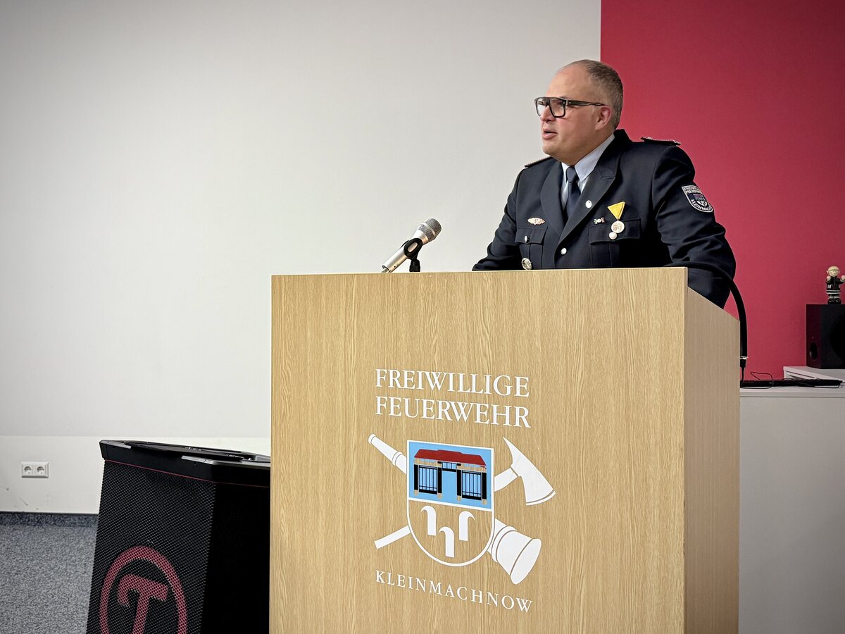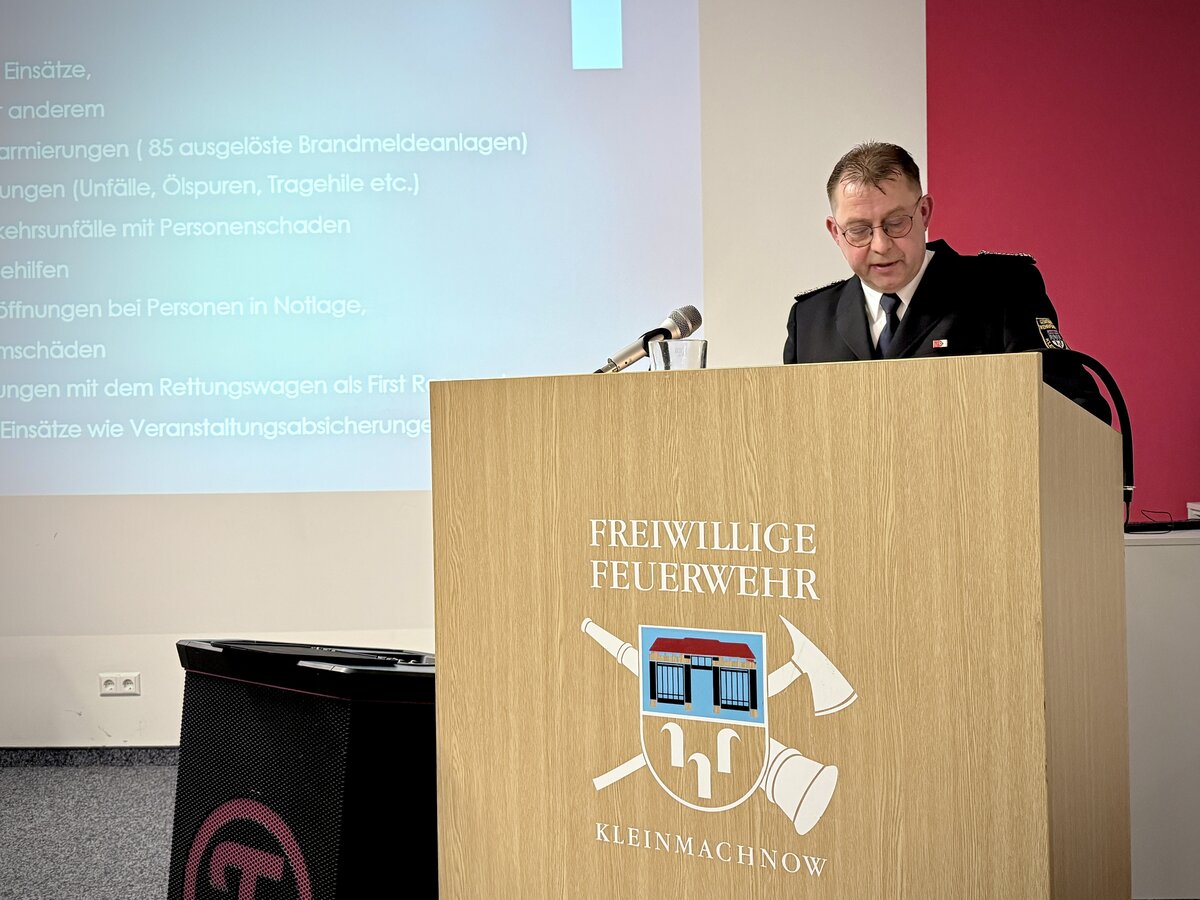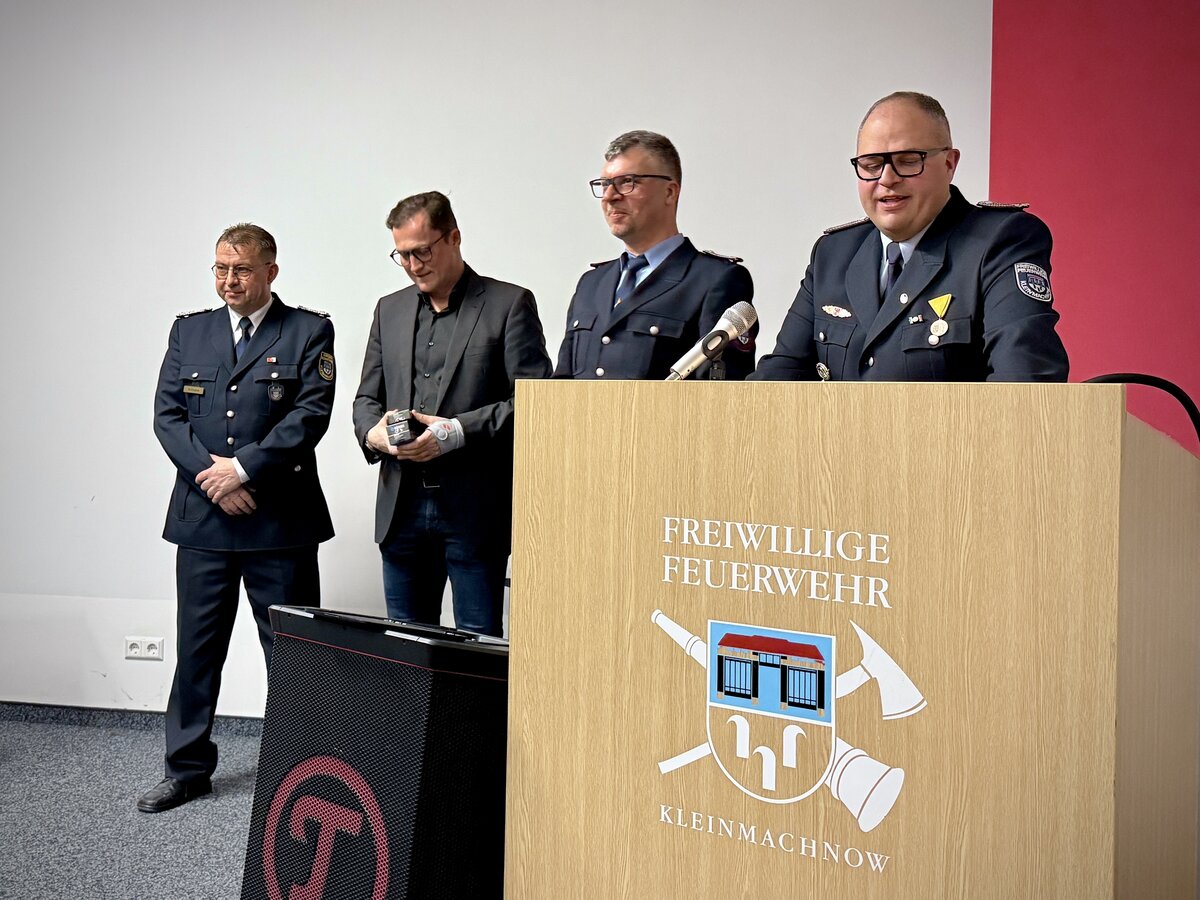 Auch Bürgermeister Bodo Krause würdigte in seiner Rede das außerordentliche Engagement der Kleinmachnower Feuerwehr. Mit Blick auf die 56 aktiven Einsatzkräfte betonte er, dass jede und jeder Einzelne angesichts der hohen Einsatzzahlen ein 8-Faches dessen leiste, was statistisch im Bundesdurchschnitt üblich sei. Die Belastung – körperlich wie gesundheitlich – dürfe nicht unterschätzt werden. Auch vor diesem Hintergrund sei die Diskussion um eine neue Feuerwache zu betrachten.