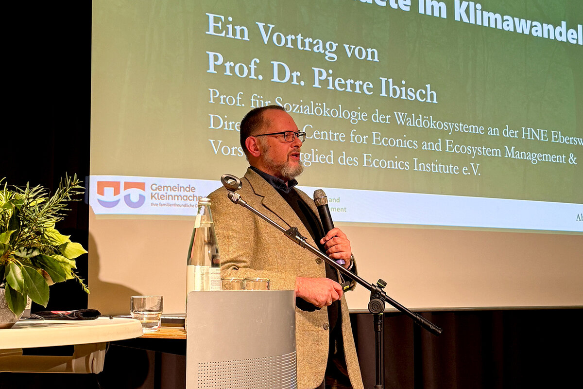 Im Mittelpunkt des Abends stand der Vortrag von Prof. Dr. Pierre Ibisch (Hochschule für nachhaltige Entwicklung Eberswalde). Er erläuterte, wie sensibel Waldökosysteme auf Hitze und Trockenheit reagieren. Darüber hinaus zeigte er auf, warum Kommunalwälder als Verbündete im Klimawandel eine Schlüsselrolle im Klimaschutz und in der Klimaanpassung spielen: