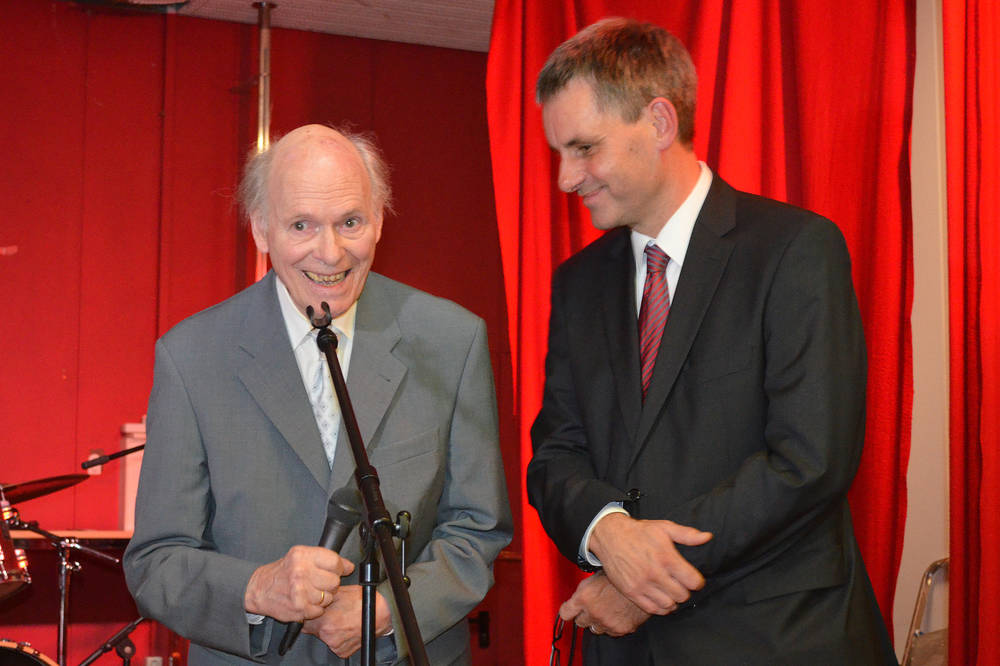 Vor zahlreichen Gästen der öffentlichen Festveranstaltung der Gemeinde Kleinmachnow setzte der 82-Jährige seinen Namen unter die erneut von der Kleinmachnower Künstlerin Lydia Hurtienne liebevoll gestaltete Seite im Goldenen Buch der Gemeinde.